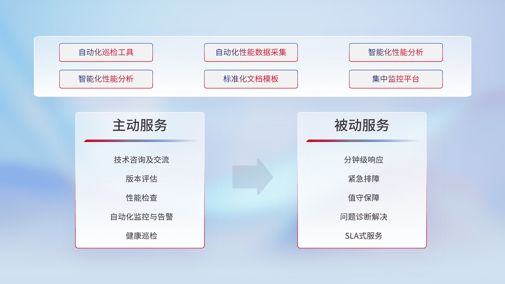 智能化工具和标准化文档,,保障服务质量,,,,提供主动服务(包含技术咨询、、、、版本评估、、、、性能检查、、、自动化监控与告警、、、健康巡检)和被动服务包含(分钟级响应、、紧急排障、、、值守保障、、问题诊断解决、、、SLA服务)。。。